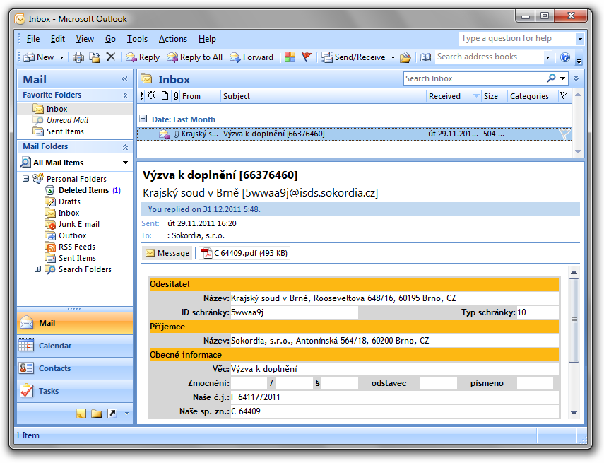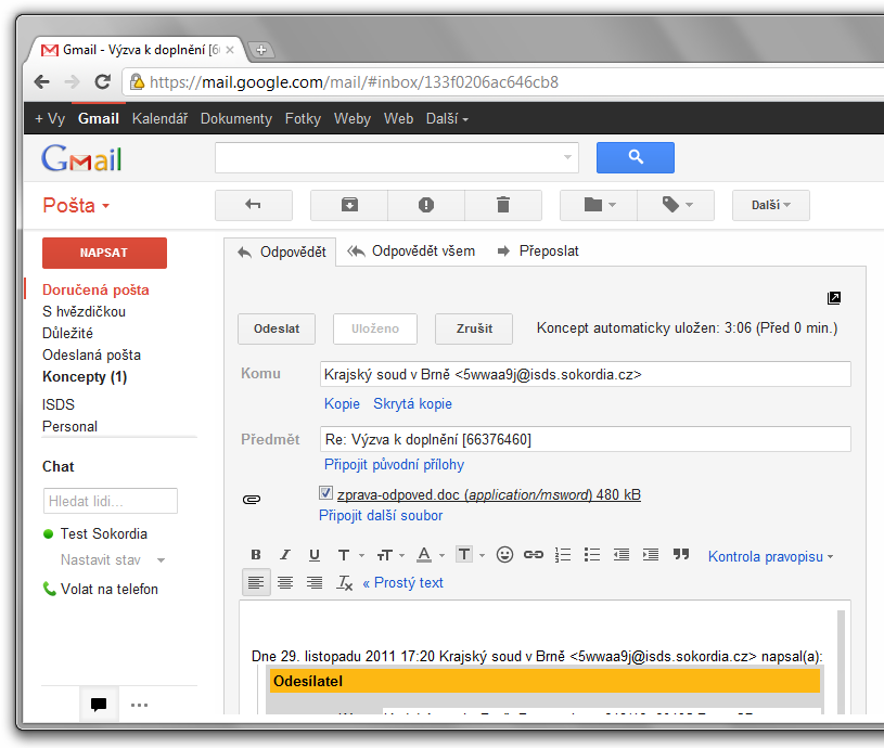 Předmět e-mailu bude použit jako Věc: v datové zprávě a k datové zprávě budou přiloženy příslušné přílohy. Na přílohy se vztahují omezení na velikost či podporované typy stejné jako v systému ISDS.